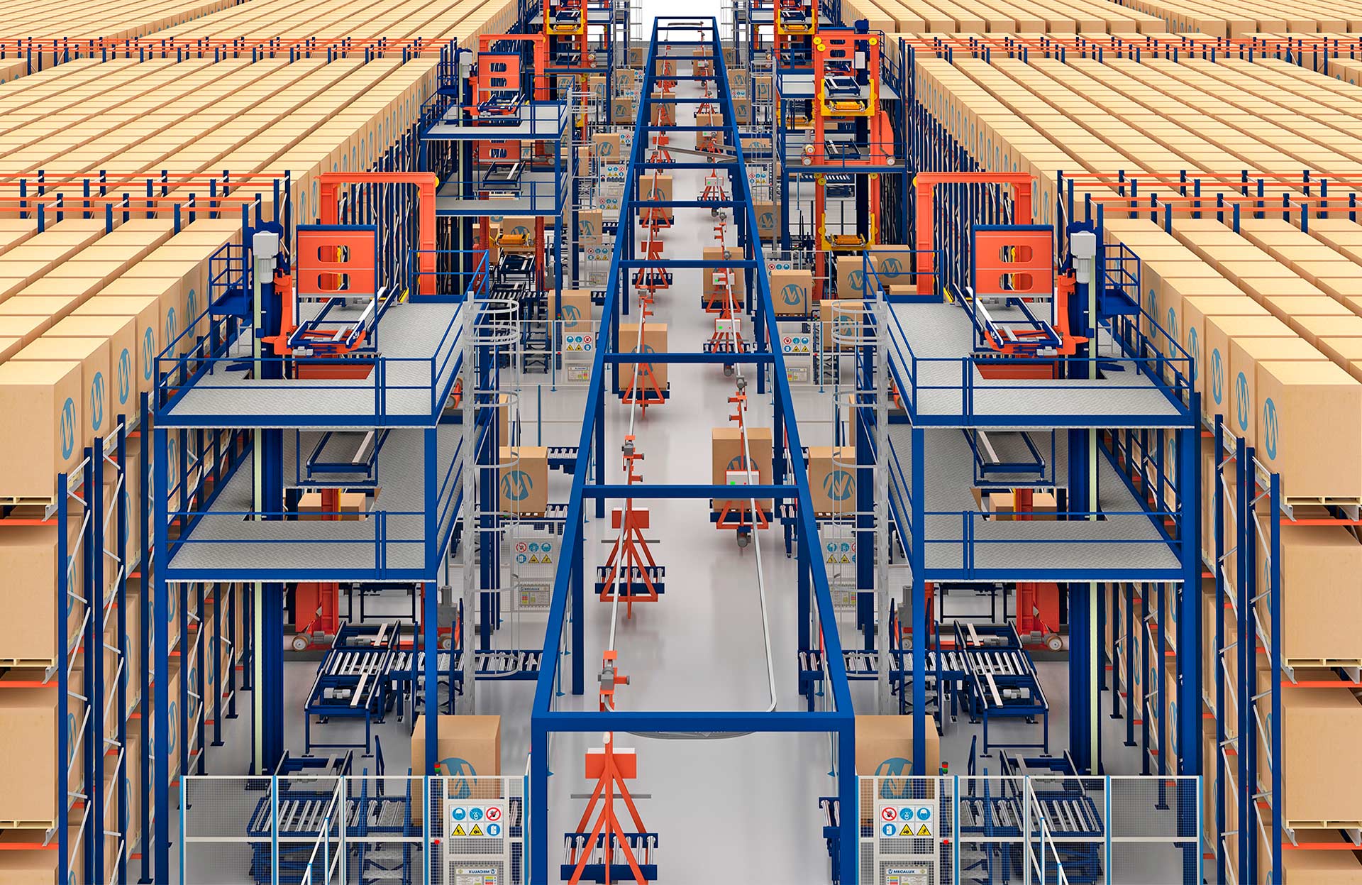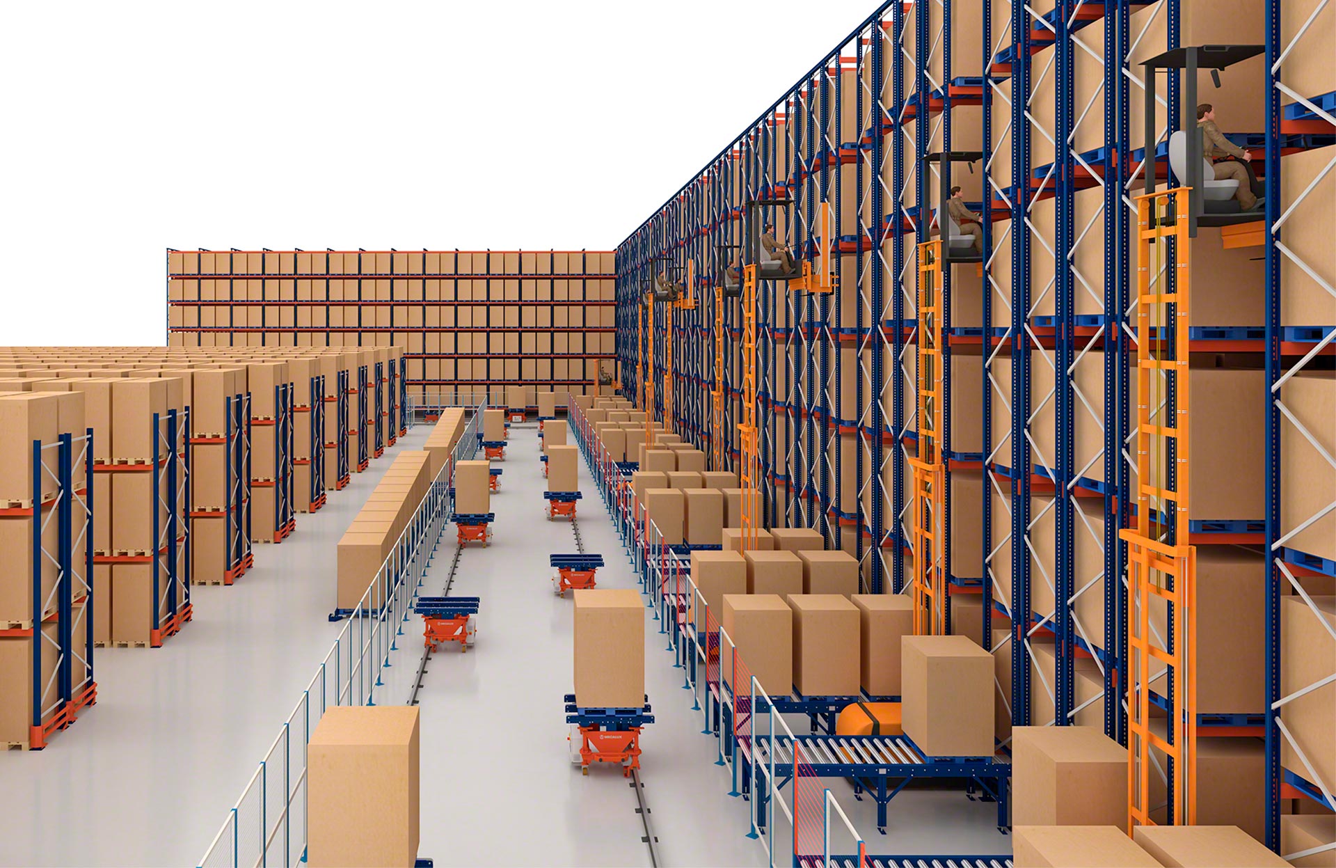 - Alta velocidad: los carros alcanzan velocidades de hasta 100 m/min con carga y 120 m/min sin carga, lo que confiere al sistema mayor rapidez frente a los transportadores y favorece la entrega de un flujo de tarimas/hora también superior.