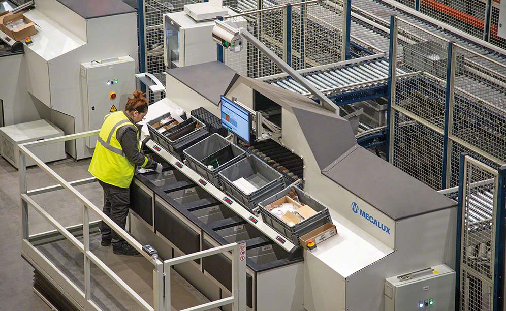 Las dos estaciones de picking de alto rendimiento, instaladas en uno de los laterales del almacén automatizado, son puestos de trabajo ergonómicos, especialmente diseñados para potenciar la preparación de múltiples pedidos a la vez. Cada estación consta de dos niveles: por el superior llegan las cajas con la mercancía para conformar los pedidos. El sistema trabaja siguiendo el principio pick-to-tote, es decir, el operador toma los productos de esas cajas y los deposita en un contenedor ─situado en el nivel inferior─ que corresponde a un pedido en concreto.