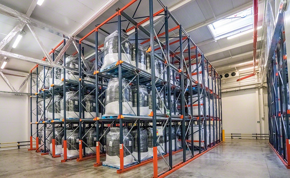 Junto a la nave de expediciones, se ubica el almacén de big-bags o sacos industriales con materias primas. Estos sacos se colocan sobre tarimas para facilitar su traslado y almacenaje en los racks.