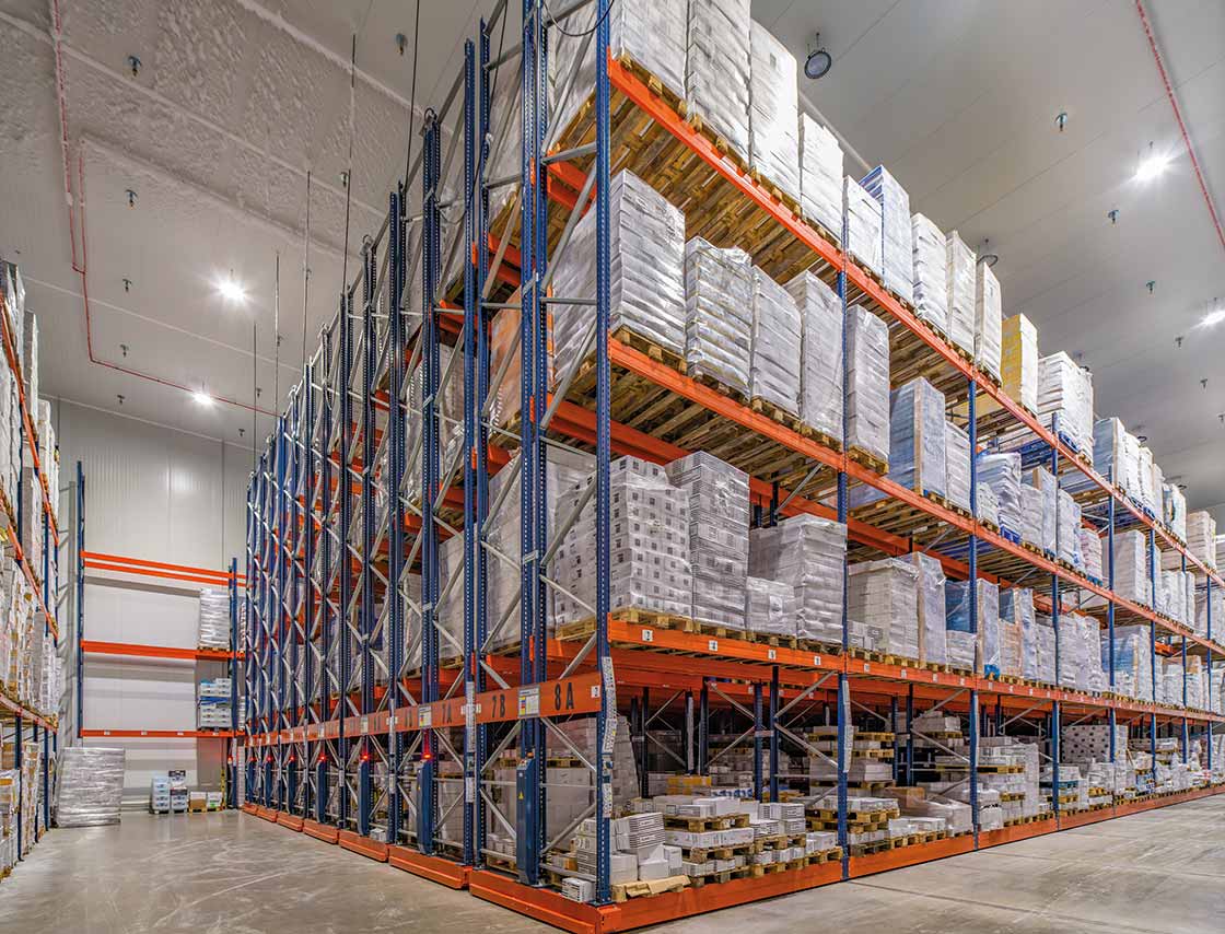 El Pallet Shuttle Automático 3D da cabida a 5,827 tarimas de materias primas y productos terminados a -24 ºC. Dentro del almacén, diez shuttles autónomos circulan por los pasillos en múltiples direcciones y cambian de nivel de modo coordinado para manejar cada tarima cuando la operación lo requiere. Un software de gestión de flotas desarrollado por Mecalux controla el tráfico de los shuttles, lo que asegura una circulación continua y fluida.
