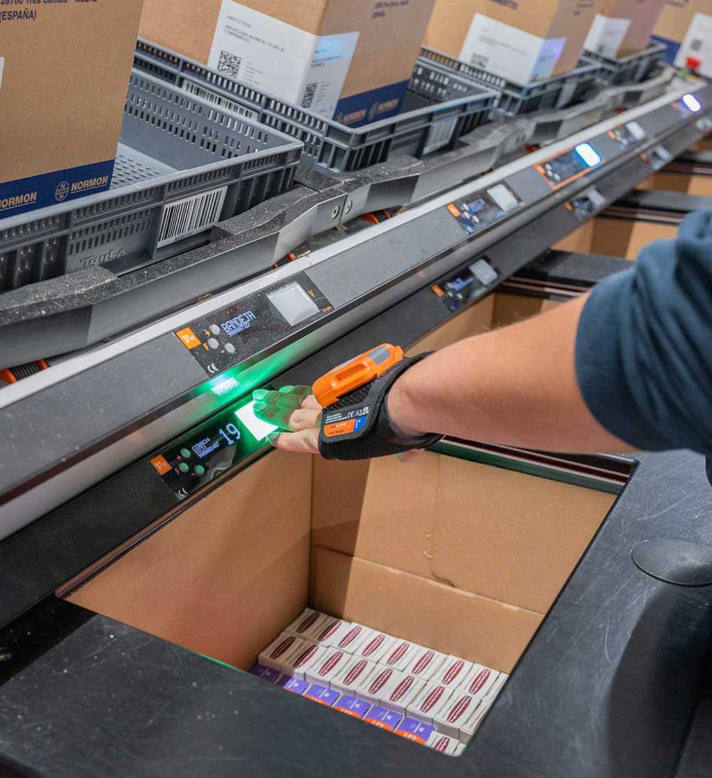 A continuación, las cajas se clasifican en un circuito de transportadores que se divide en tres ramales (clasificador tipo sorter) y descienden hasta la zona de expediciones en la planta inferior. Allí, con la ayuda de terminales de radiofrecuencia, los operadores retiran las cajas a medida que estas se deslizan por los 140 racks carton flow y las colocan en las tarimas que se enviarán a los clientes.