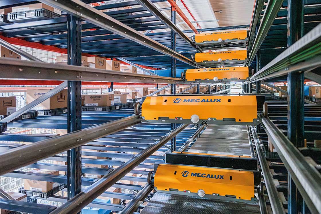 El Sistema Shuttle en Normon es una solución de almacenamiento diseñada para picking masivo: incluye 46 lanzaderas que manipulan cajas en racks de triple profundidad con capacidad para 22,000 unidades. Las cajas, almacenadas sobre charolas de 400 x 400 mm, son gestionadas de forma totalmente automatizada. Esta tecnología permite a los operadores centrarse en la preparación de pedidos mientras el sistema realiza las reposiciones.
