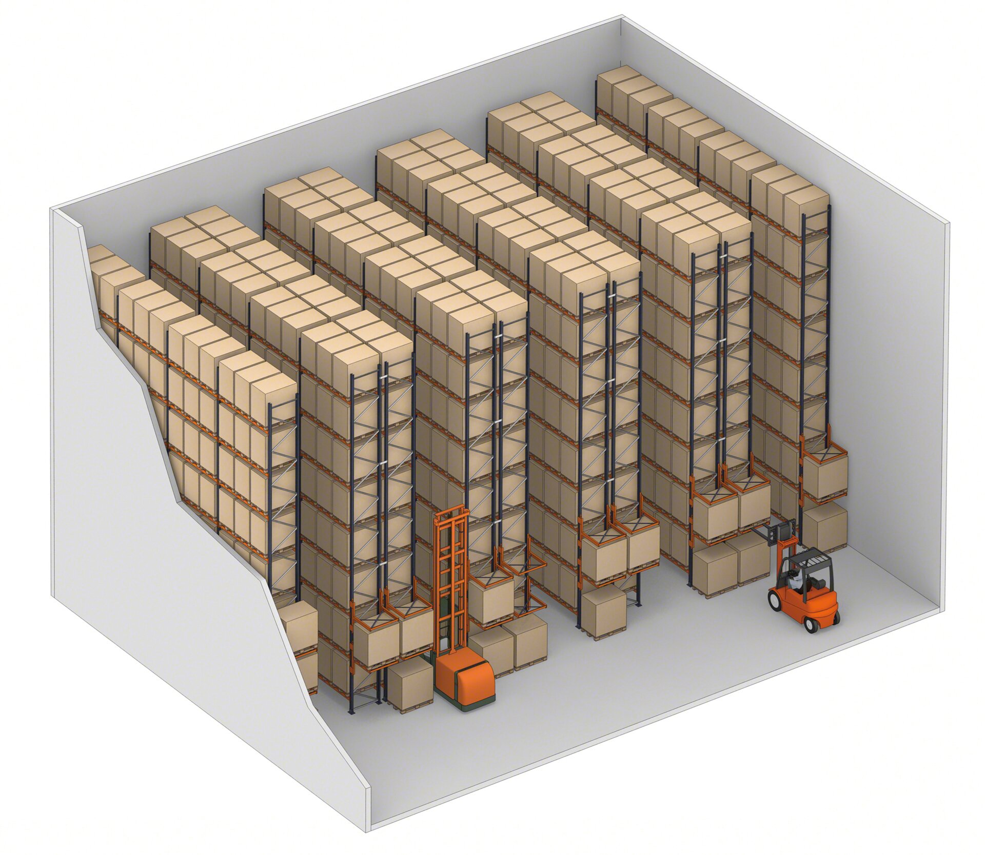 Se puede trabajar con cualquier tipo de montacargas (contrabalanceados, retráctiles, tipo torre, etc.), siempre que el pasillo tenga el ancho adecuado y los equipos alcancen los niveles de carga superiores. En el caso de los racks selectivos de doble profundidad, el montacargas utilizado debe contar con horquillas telescópicas para acceder a la tarima más alejada.